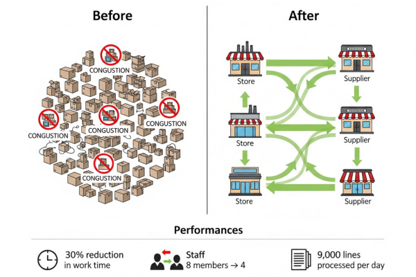 全国300店舗を展開するゴディバ ジャパン様。イベントシーズンには膨大な注文が集中し、12社に渡るサプライヤーとやり取りが発生。本部を経由した従来方式では受注センターの負荷が限界に達していました。
